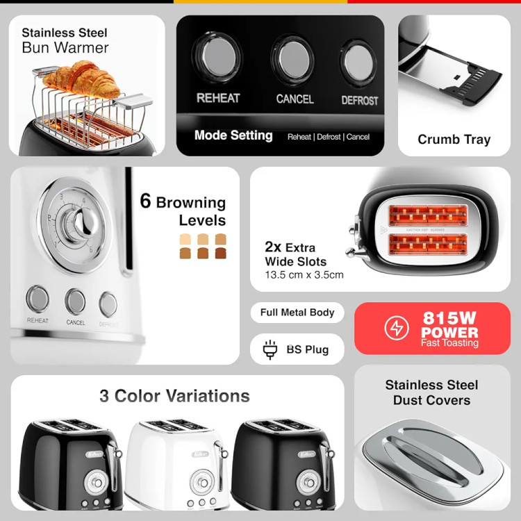 این توستر نان از نوع دو خانه می باشد. ابعاد هر یک از اسلات ها دارای اندازه 13.5 در 3.5 سانتی متر بوده که می توانید علاوه بر نان تست از سایر نان های سنتی در ابعاد ذکر شده استفاده کنید.